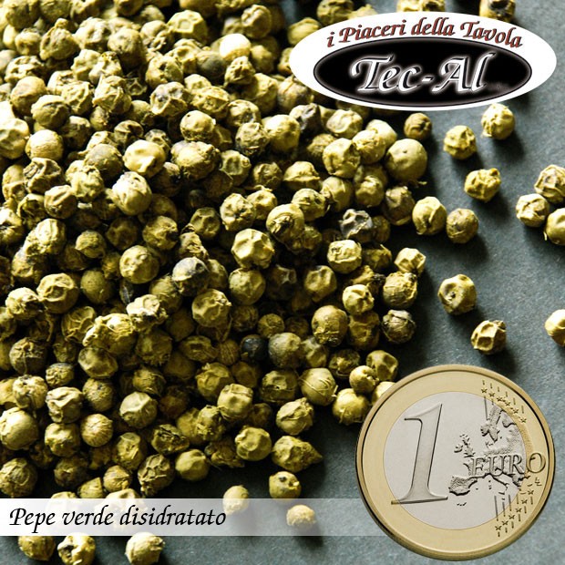 Il pepe è una pianta tropicale rampicante della famiglia delle Piperacee. I suoi frutti sono verdi se acerbi e neri se maturi. Il pepe verde è preparato con i grani acerbi della pianta del Piper Nigrum (rampicante sempreverde che cresce nella giungla umida delle zone tropicali), i frutti presentano una superficie rugosa, reticolata e di colore bruno, con pericarpo sottile e fragile. Trattandosi delle bacche non ancora mature, il loro colore varia dal verde pallido al verde; l’odore e l’aroma sono tipici del pepe fresco, non ancora giunto a maturazione. Oltre che disidratato in grani é, su richiesta, macinato.