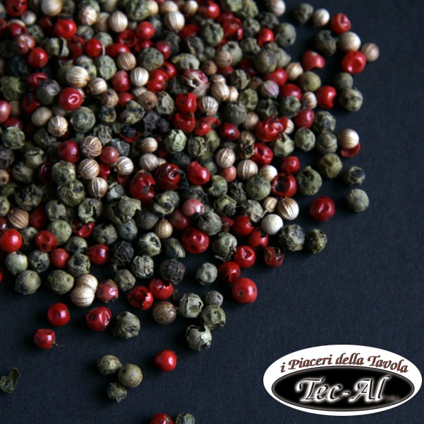 Ingredienti: Spezie in proporzione variabile: pepe nero, pepe bianco, pepe verde, pepe rosa, coriandolo.