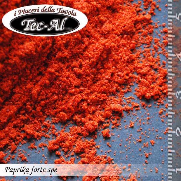 La paprika forte si ottiene, dopo la raccolta, l’essicazione, la frantumazione e la polverizzazione di tutto il frutto, compreso i semi (piccanti) e, nel caso di standardizzazione particolari, con l’aggiunta di peperoncini piccanti (con diverso contenuto di capsicina). Sono bacche coniche allungate, ovvero brevi e larghe, lisce, di colore verde quando sono immature, di solito gialle o rosse quando sono a maturità completa. Sono vuote nella parte superiore e portano nella parte inferiore numerosi semi. E’ commercializzata in polvere.