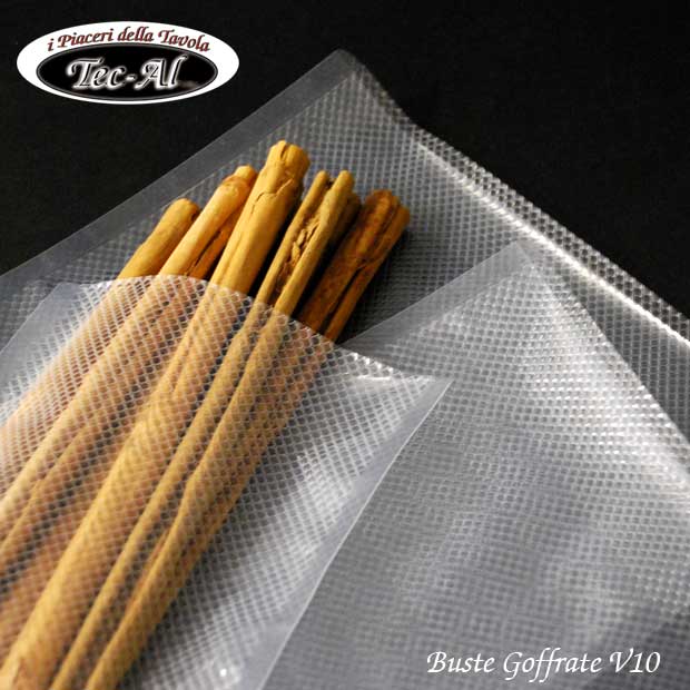 Buste idonee per il confezionamento sottovuoto di alimenti con macchine ad aspirazione esterna.