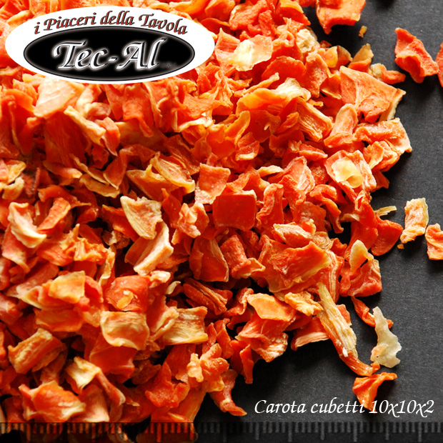 Ortaggio essiccato in cubetti per alimenti. Ingredienti: carota cubetti (Daucus carota).