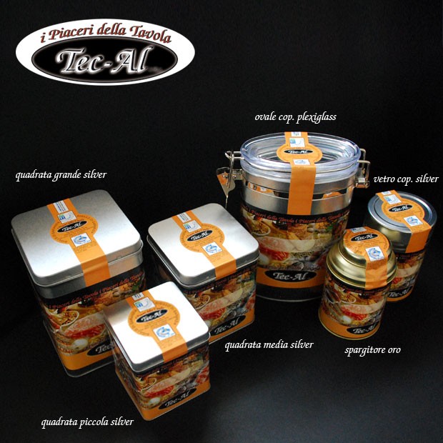 Scatola in banda stagnata laccata rotonda spargitore. Espositore da 6 pezzi.