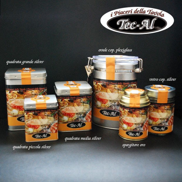 Scatola in banda stagnata laccata rotonda spargitore. Espositore da 6 pezzi.