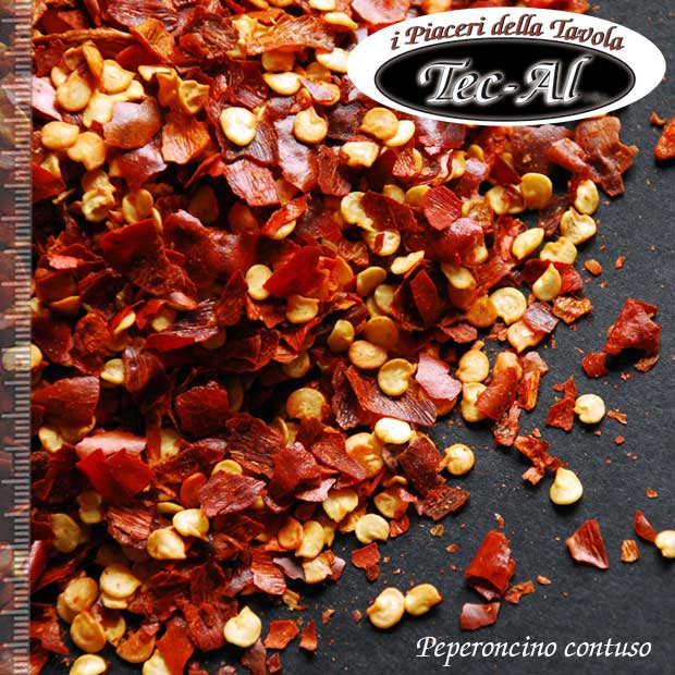 Spezia essiccata per alimenti. Ingredienti: peperoncino contuso (Capsicum Frutescens oppure Capsicum annuum.)