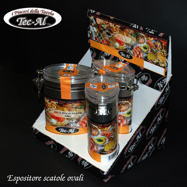 Scatola in banda stagnata laccata rotonda spargitore. Espositore da 6 pezzi.